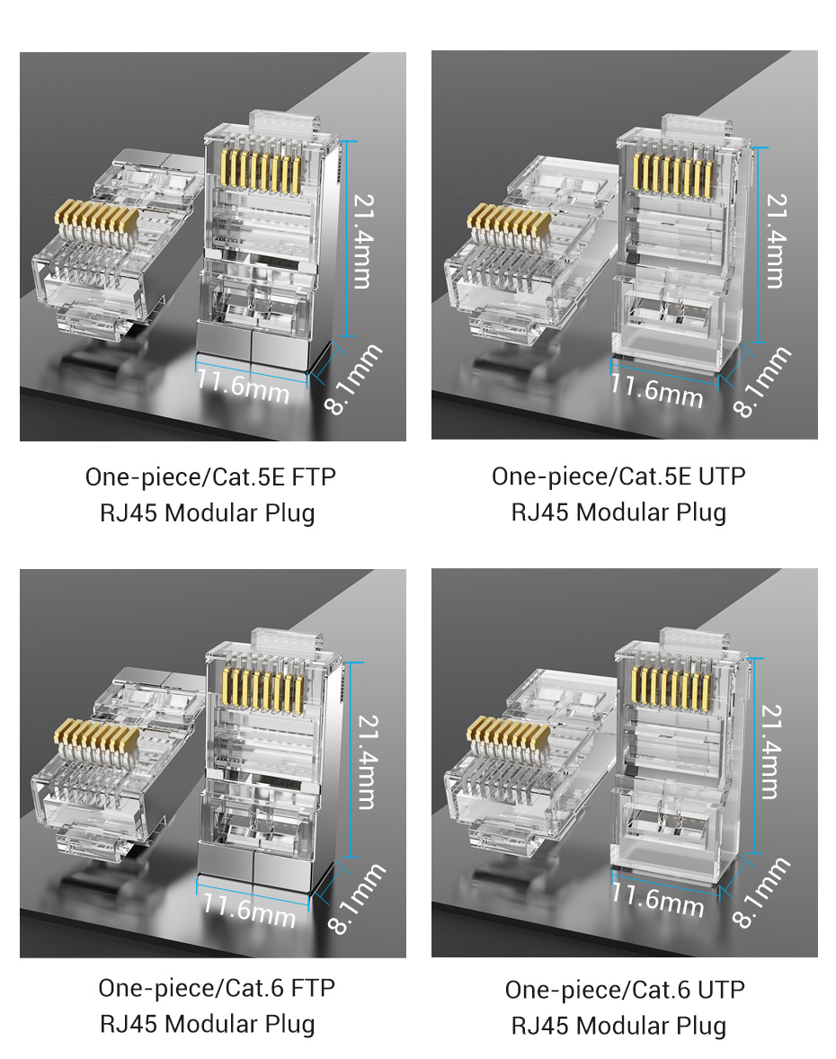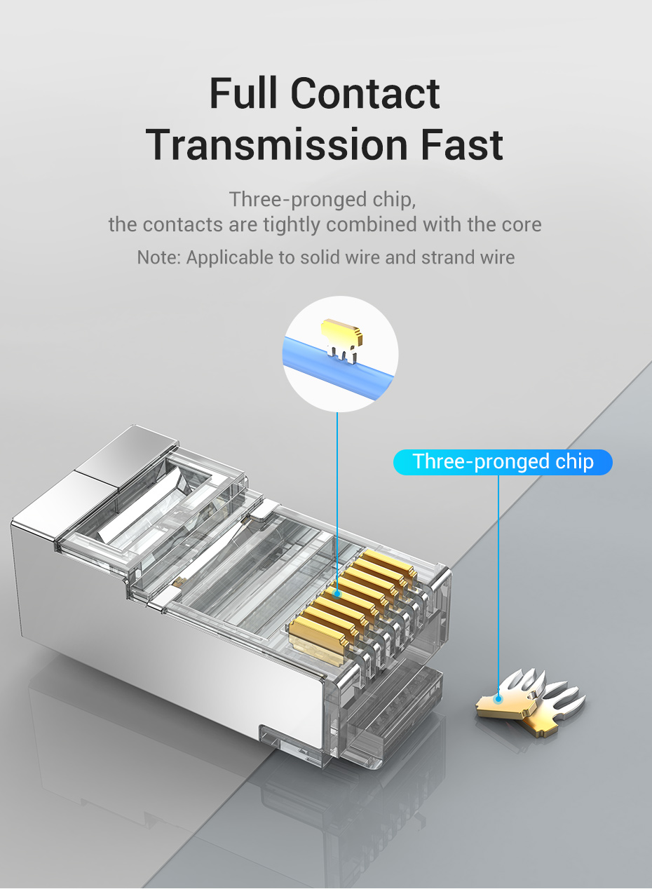 Vention IDC series Cat.6 FTP RJ45 Modular Plug Transparent. High-quality Gold-Plated Chips for excellent conductivity. Full contact with three-pronged chip, the contacts are tightly combined with the core for transmission fast. Thick Gold-plated terminals, the network speed is still stable for a long time. Metal shielded shell for more stable transmission and anti-interference. High-quality PC material for corrosion resistant and tough. Passed FLUKE strict test standards, high quality, and reliable. Comes with 10 pieces, 50 pieces, and 100 pieces package.