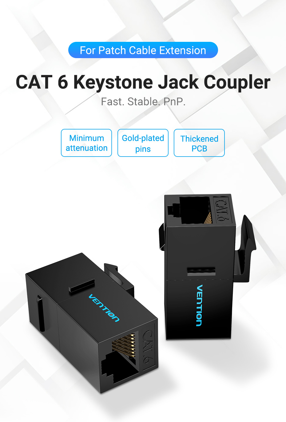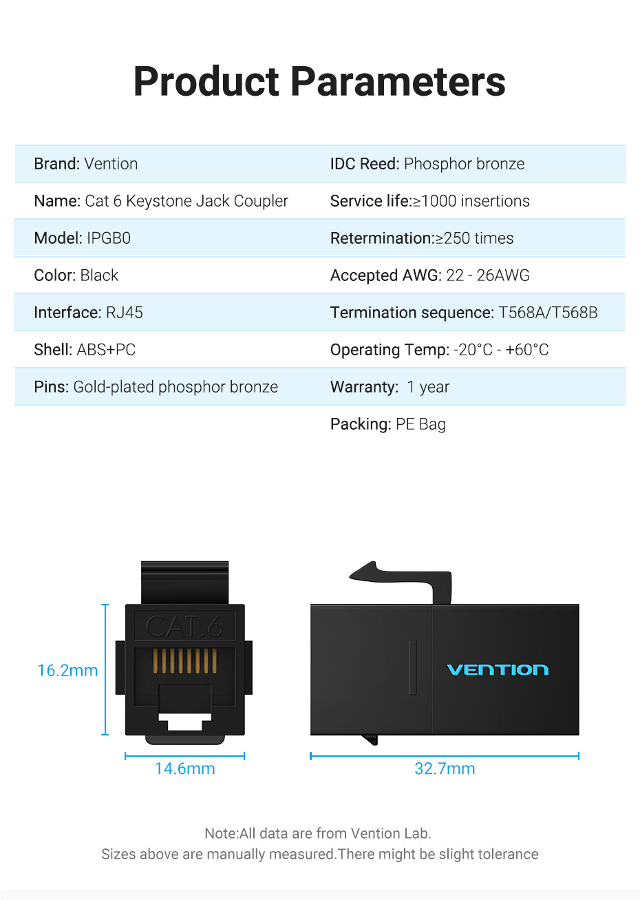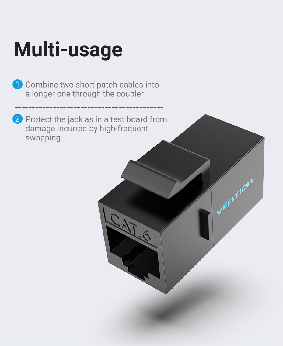 Vention IPG series Cat6 UTP Keystone Jack Coupler. Allow extend freely to combine two patch cables into one to complement insufficiency in embedment. Gold-plated pins for better conductivity for stable transmission & minimum attenuation. ABS and PC shell for high strength and high temperature resistance. Applicable to multiple scenes with 86 keystone wall plate and patch panel. Passed FLUKE network test. Color available black and white.