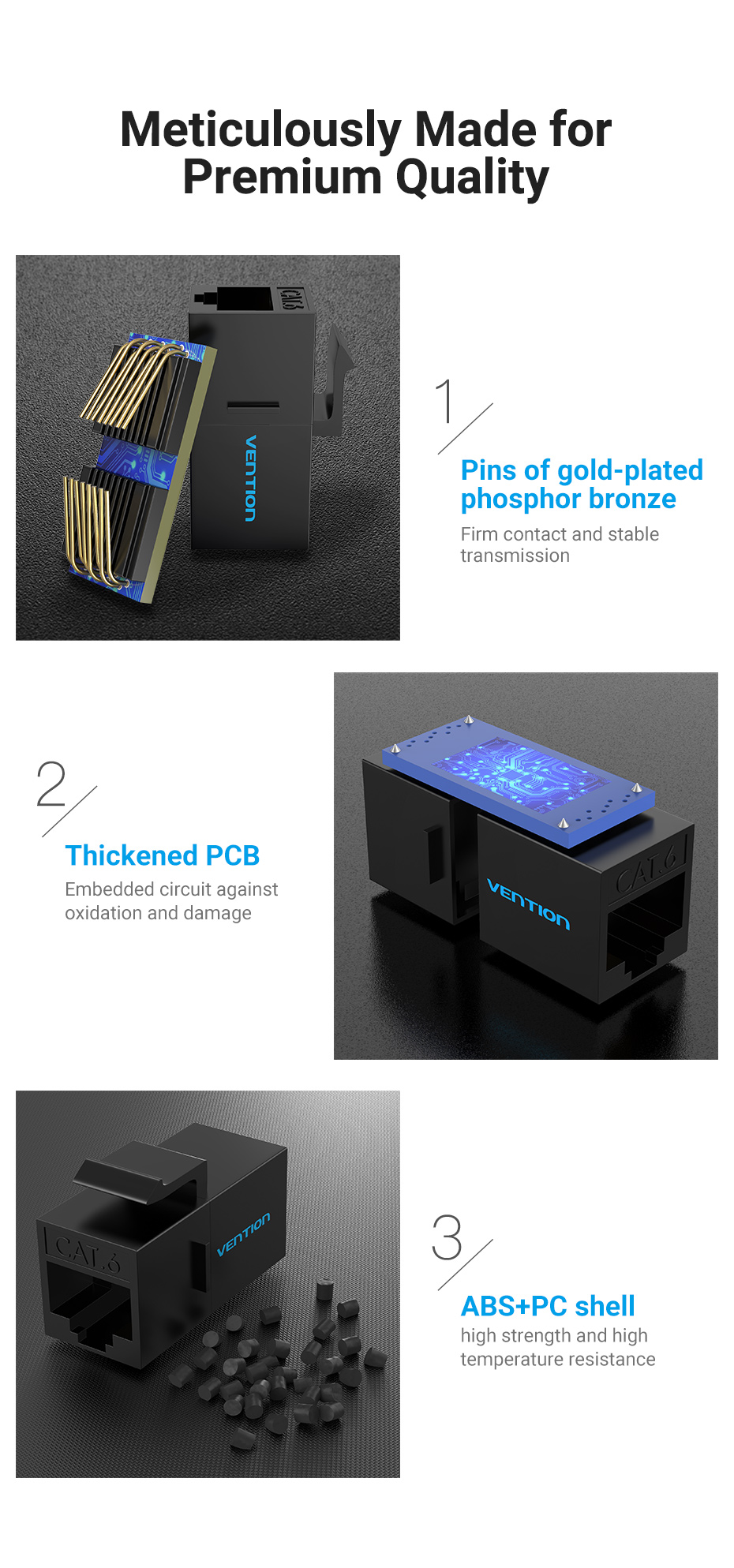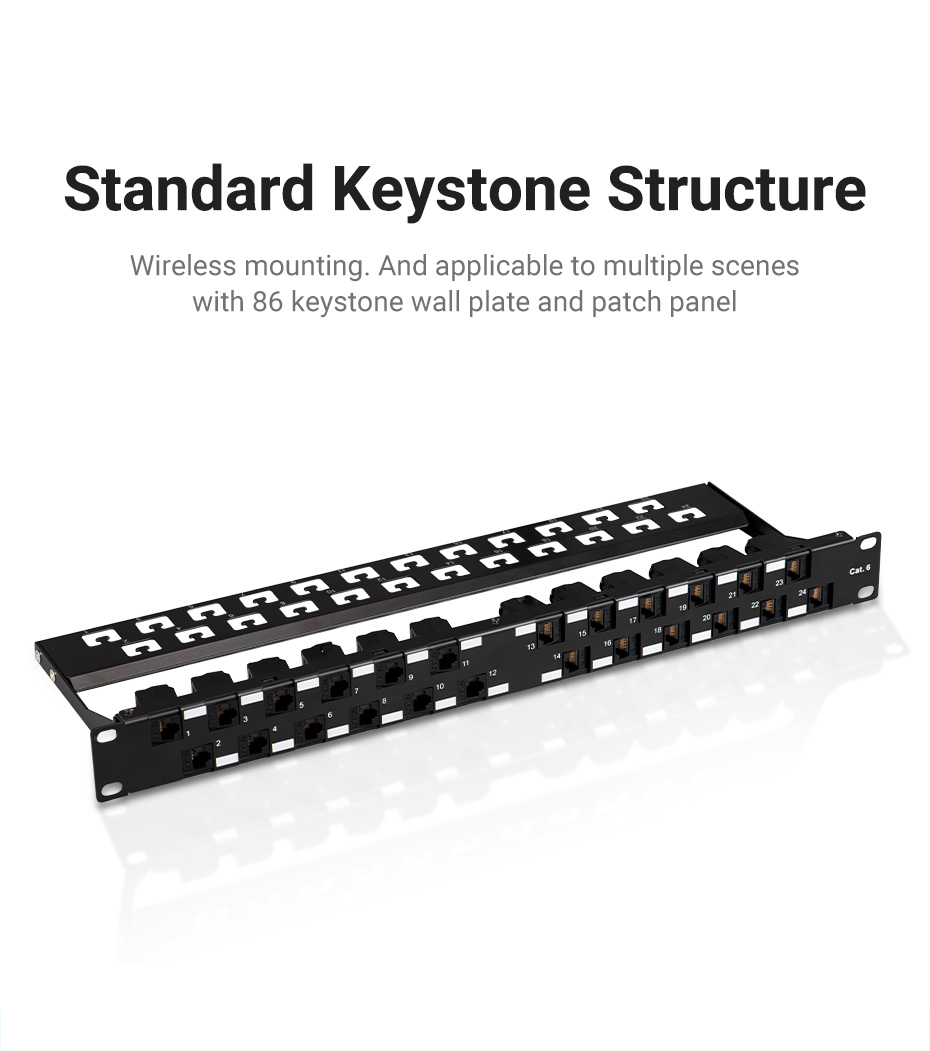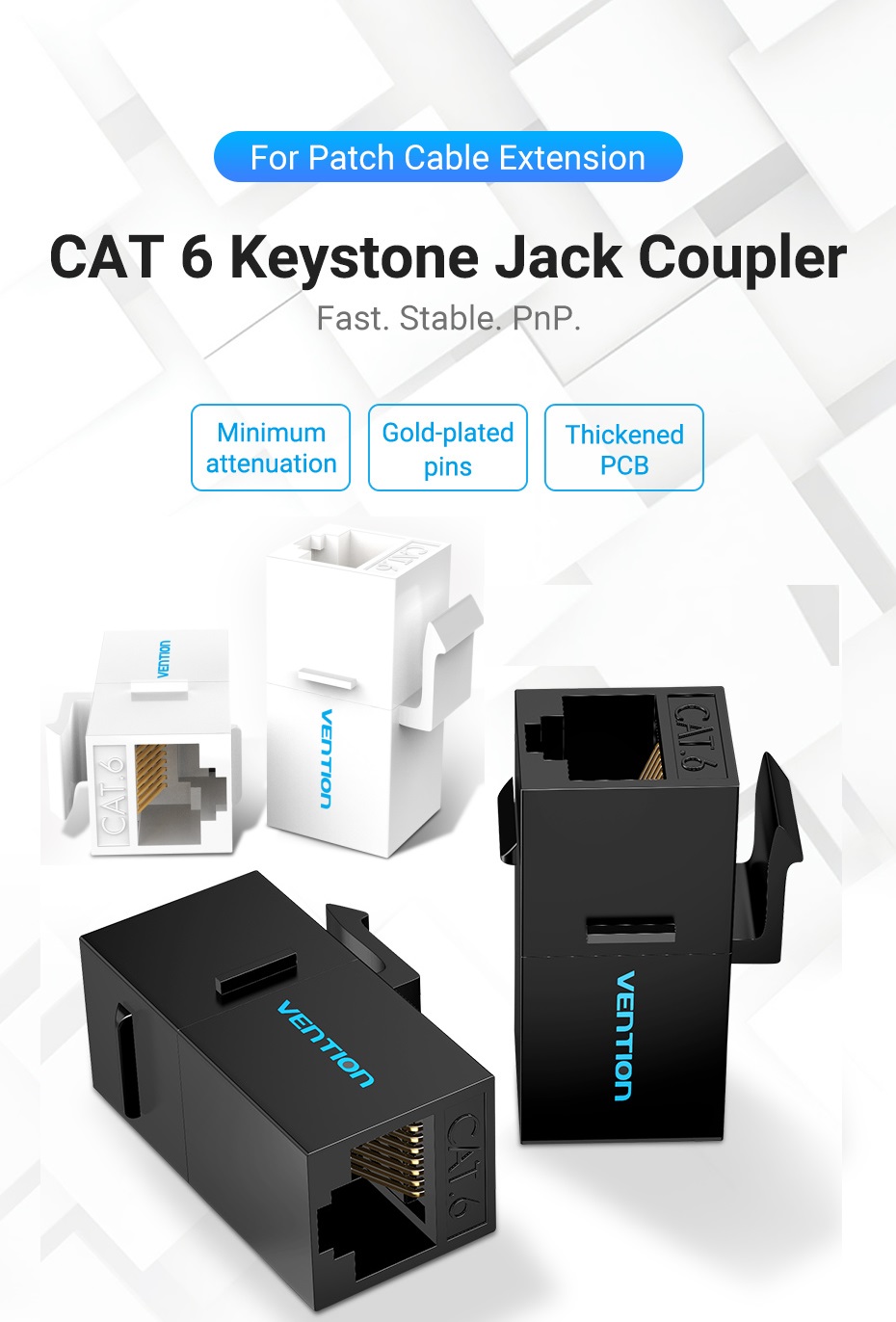 Vention IPG series Cat6 UTP Keystone Jack Coupler. Allow extend freely to combine two patch cables into one to complement insufficiency in embedment. Gold-plated pins for better conductivity for stable transmission & minimum attenuation. ABS and PC shell for high strength and high temperature resistance. Applicable to multiple scenes with 86 keystone wall plate and patch panel. Passed FLUKE network test. Color available black and white.