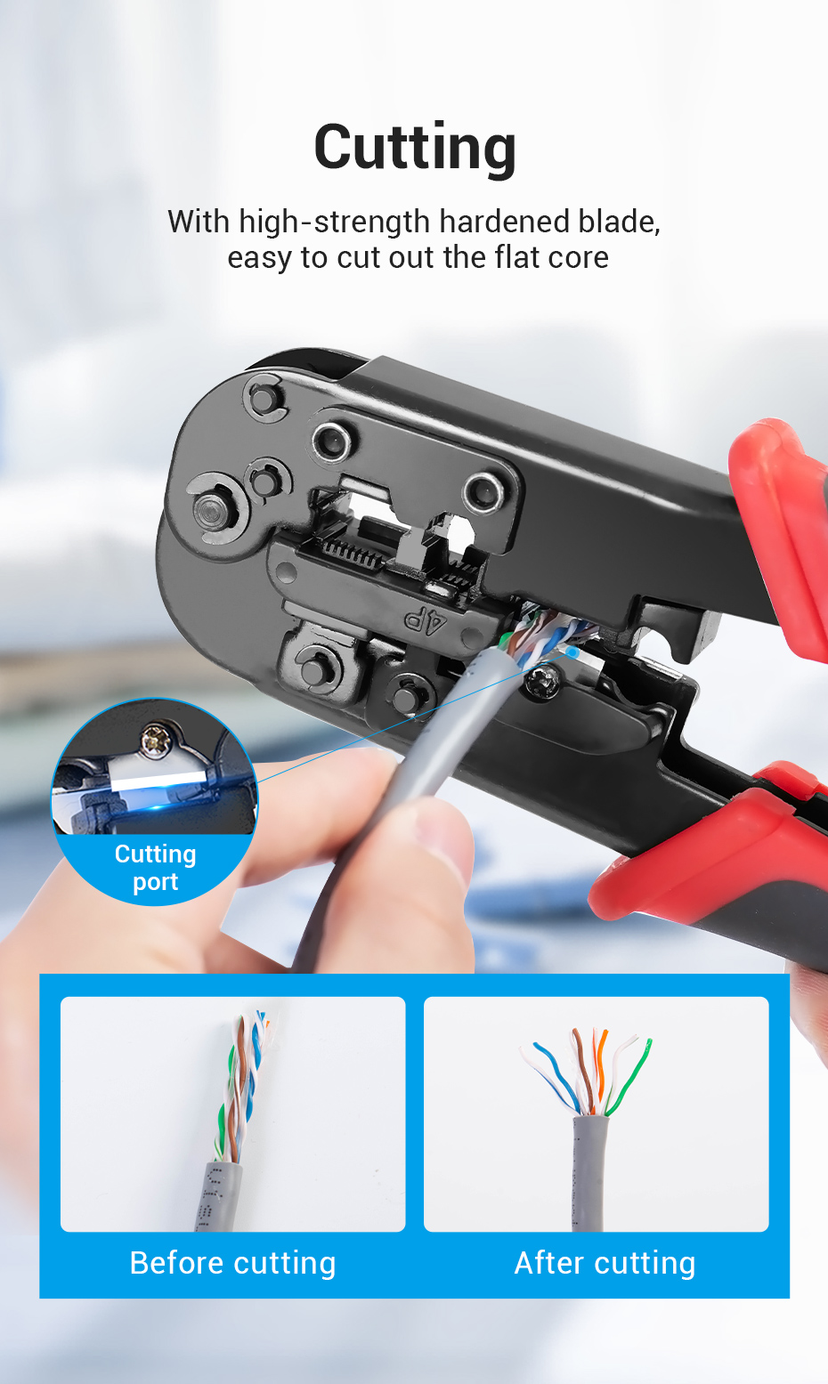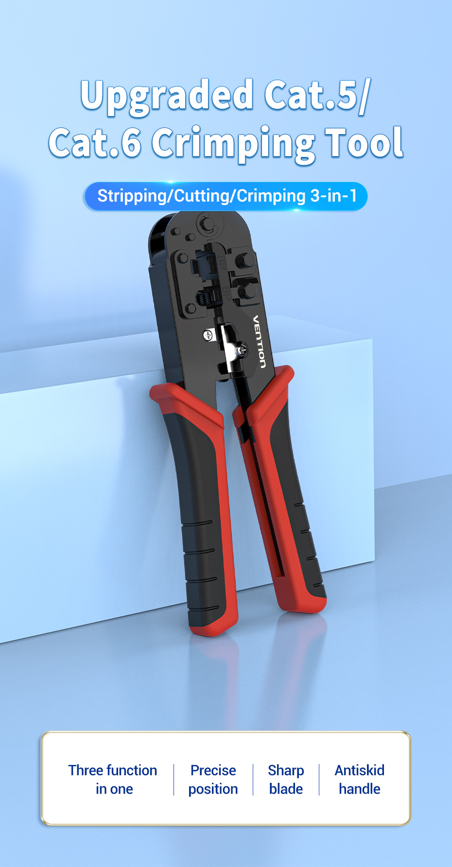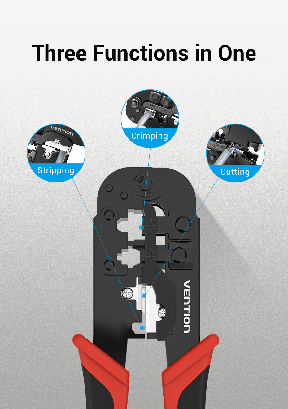 Vention KED series Multi-Function LAN Cable Crimping Tool Ratchetless Type. Three Function in one tool. Stripping with high-strength hardened blade, not easy to damage the internal cable core. Cutting with high-strength hardened blade, easy to cut out the flat core. Crimping standard port size, reduce plug damage rate. Wide range of application suitable for Cat.5e/Cat.6 shielded and unshielded plug.