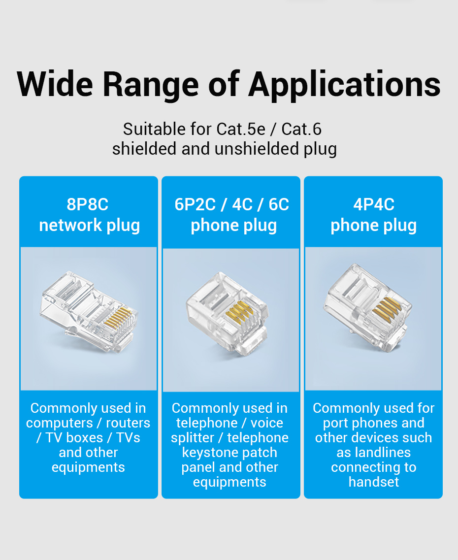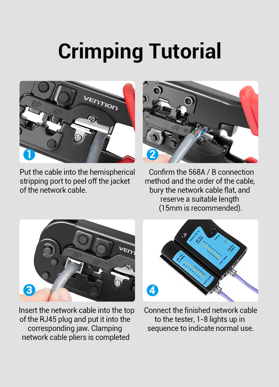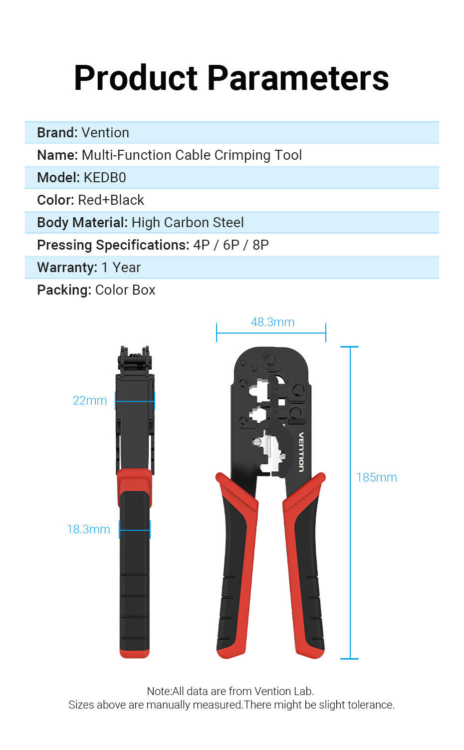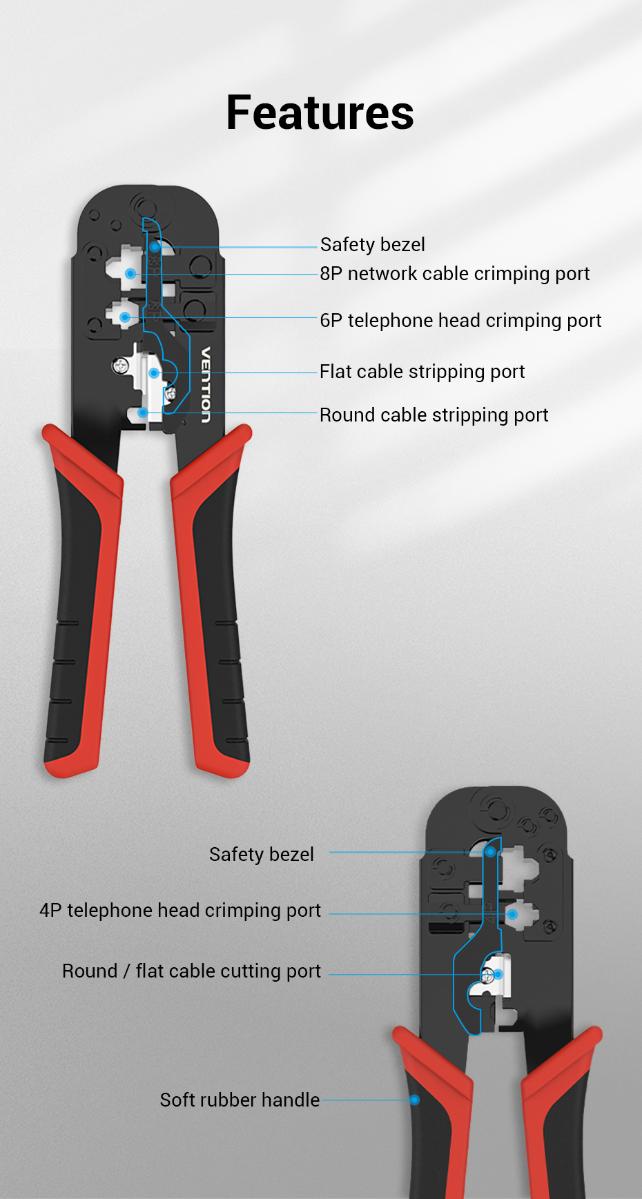 Vention KED series Multi-Function LAN Cable Crimping Tool Ratchetless Type. Three Function in one tool. Stripping with high-strength hardened blade, not easy to damage the internal cable core. Cutting with high-strength hardened blade, easy to cut out the flat core. Crimping standard port size, reduce plug damage rate. Wide range of application suitable for Cat.5e/Cat.6 shielded and unshielded plug.